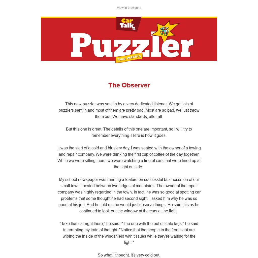 And this thought was the beginning of this new puzzler. Almost every car now has its pieces attached to some neighboring piece on the car. Every piece is attached to some other piece, otherwise, stuff would just fall off on the highway and be left on the road.