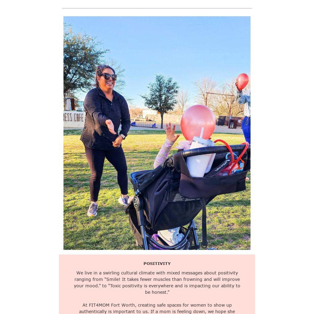 At FIT4MOM Fort Worth, creating safe spaces for women to show up authentically is important to us. If a mom is feeling down, we hope she chooses to bring her whole self to class, knowing she can come with her tears, disappointment, and grief. Frustration is inevitable in motherhood. Moms don’t need to swap out their furrowed brows and tense shoulders for smiles before working out with us. Parenting can be filled with worry. Our community members are welcome to bring their concerns about milestones, jobs, relationships, etc to F4M instead of pretending they are burdenless for the sake of positivity.
