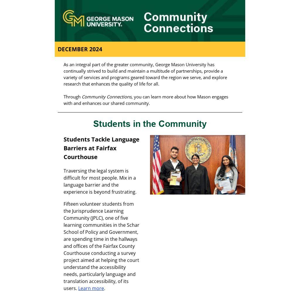 Through Community Connections, you can learn more about how Mason engages with and enhances our shared community.