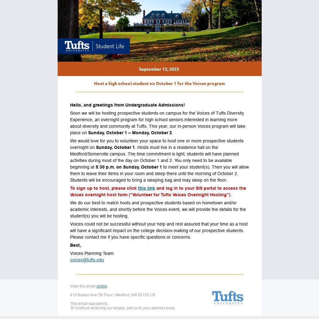 To sign up to host, please click this link and log in to your SIS portal to access the Voices overnight host form (“Volunteer for Tufts Voices Overnight Hosting”).
