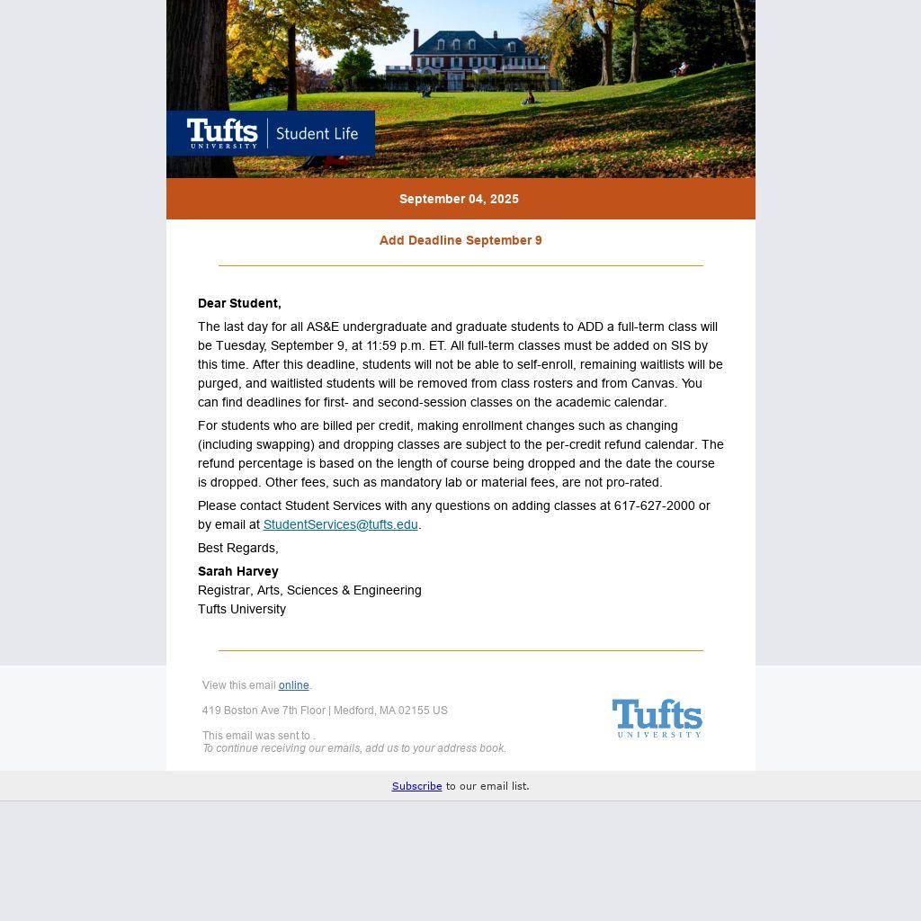 Please contact Student Services with any questions on adding classes at 617-627-2000 or by email at StudentServices@tufts.edu.