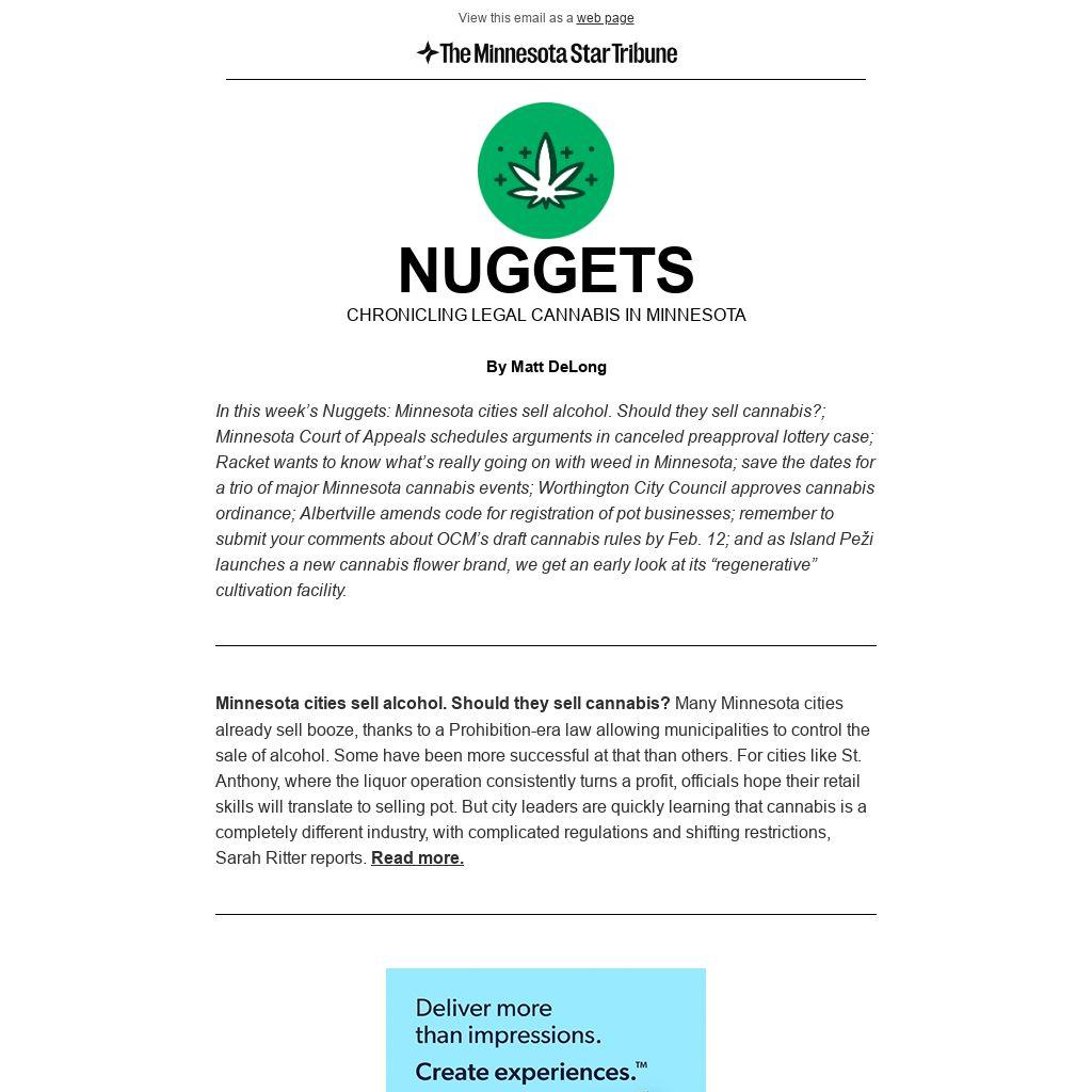 In this week’s Nuggets: Minnesota cities sell alcohol. Should they sell cannabis?; Minnesota Court of Appeals schedules arguments in canceled preapproval lottery case; Racket wants to know what’s really going on with weed in Minnesota; save the dates for a trio of major Minnesota cannabis events; Worthington City Council approves cannabis ordinance; Albertville amends code for registration of pot businesses; remember to submit your comments about OCM’s draft cannabis rules by Feb. 12; and as Island Peži launches a new cannabis flower brand, we get an early look at its “regenerative” cultivation facility.