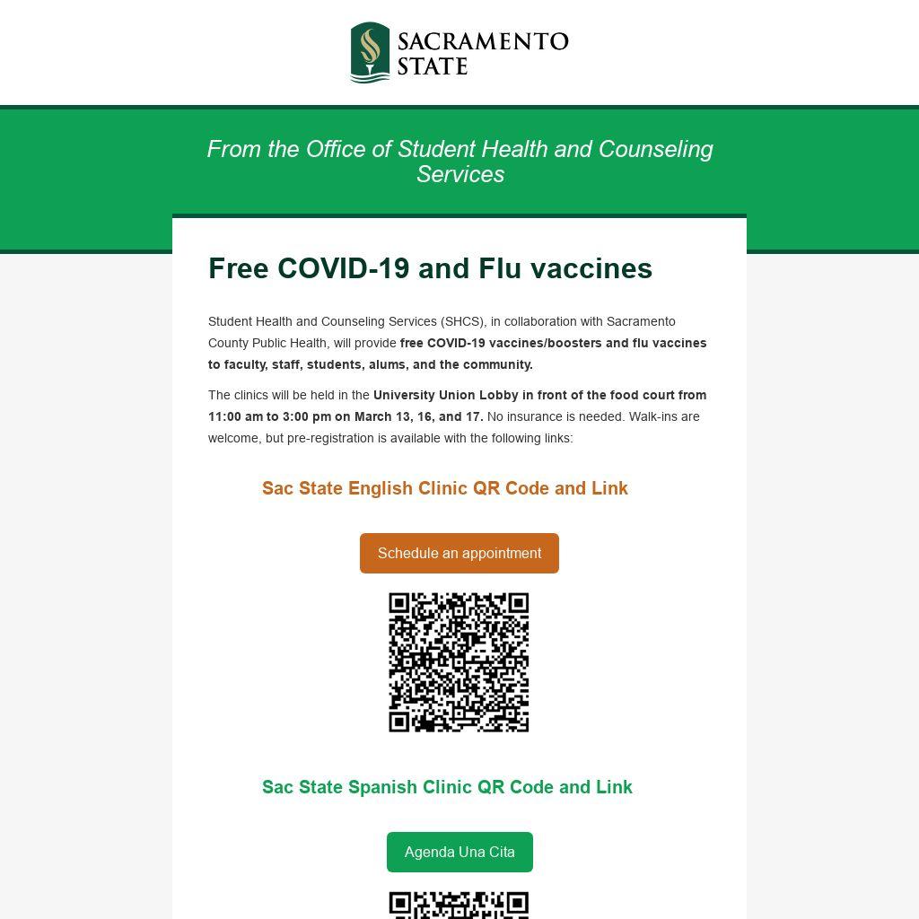 Student Health and Counseling Services (SHCS), in collaboration with Sacramento County Public Health, will provide free COVID-19 vaccines/boosters and flu vaccines to faculty, staff, students, alums, and the community.
