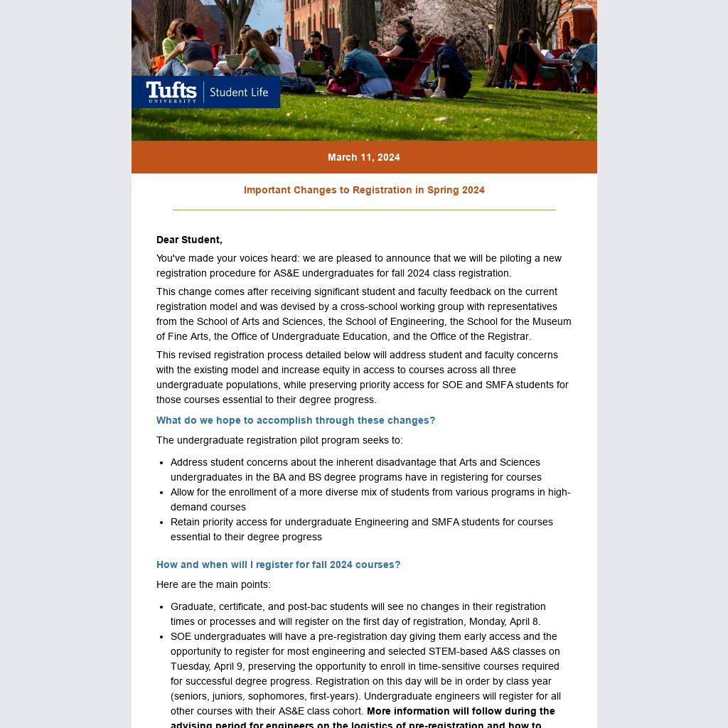 We are excited to roll out this new pilot process in the coming weeks and believe it will offer an enhanced experience for undergraduate students. If you have questions or need support during registration, contact Student Services at studentservices@tufts.edu or by calling 617-627-2000 on Monday through Friday at 10 a.m.–5 p.m.