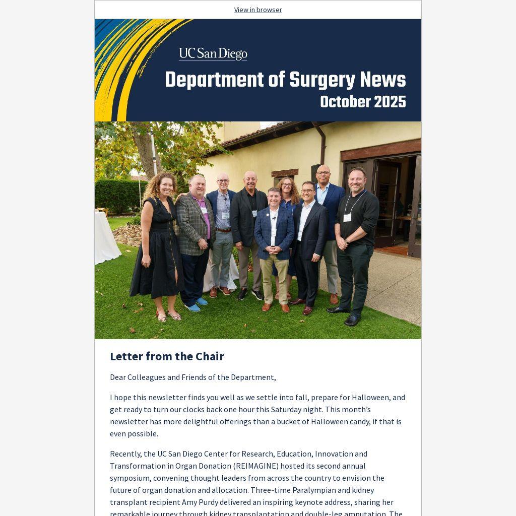 Lastly, I wanted to draw your attention to the high level of engagement with our social media channels. Over the past two months, our Instagram account received nearly 1.5 million views. We had the privilege of going on a video tour with Division Chief Anne Wallace, M.D., and Vince Genna, N.P., of the new Barbara Parker, M.D., Breast Center at the McGrath Outpatient Pavilion in Hillcrest. In addition, we joined Division Chief Geoffroy Noel, Ph.D., for a day in the life of his summertime global anatomy seminar in Paris, France. I invite you to follow us at @UCSDSurgery to stay informed about departmental highlights, achievements and upcoming events.