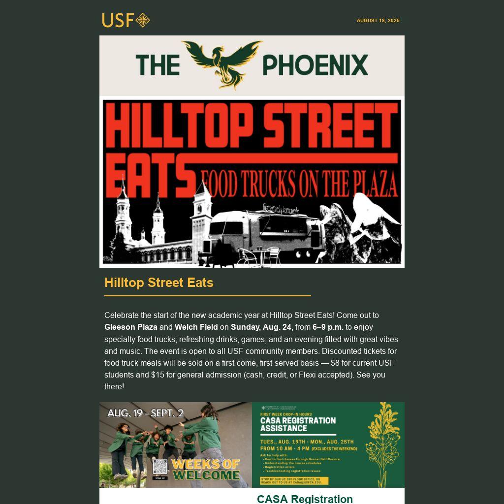 Celebrate the start of the new academic year at Hilltop Street Eats! Come out to Gleeson Plaza and Welch Field on Sunday, Aug. 24, from 6–9 p.m. to enjoy specialty food trucks, refreshing drinks, games, and an evening filled with great vibes and music. The event is open to all USF community members. Discounted tickets for food truck meals will be sold on a first-come, first-served basis — $8 for current USF students and $15 for general admission (cash, credit, or Flexi accepted). See you there!