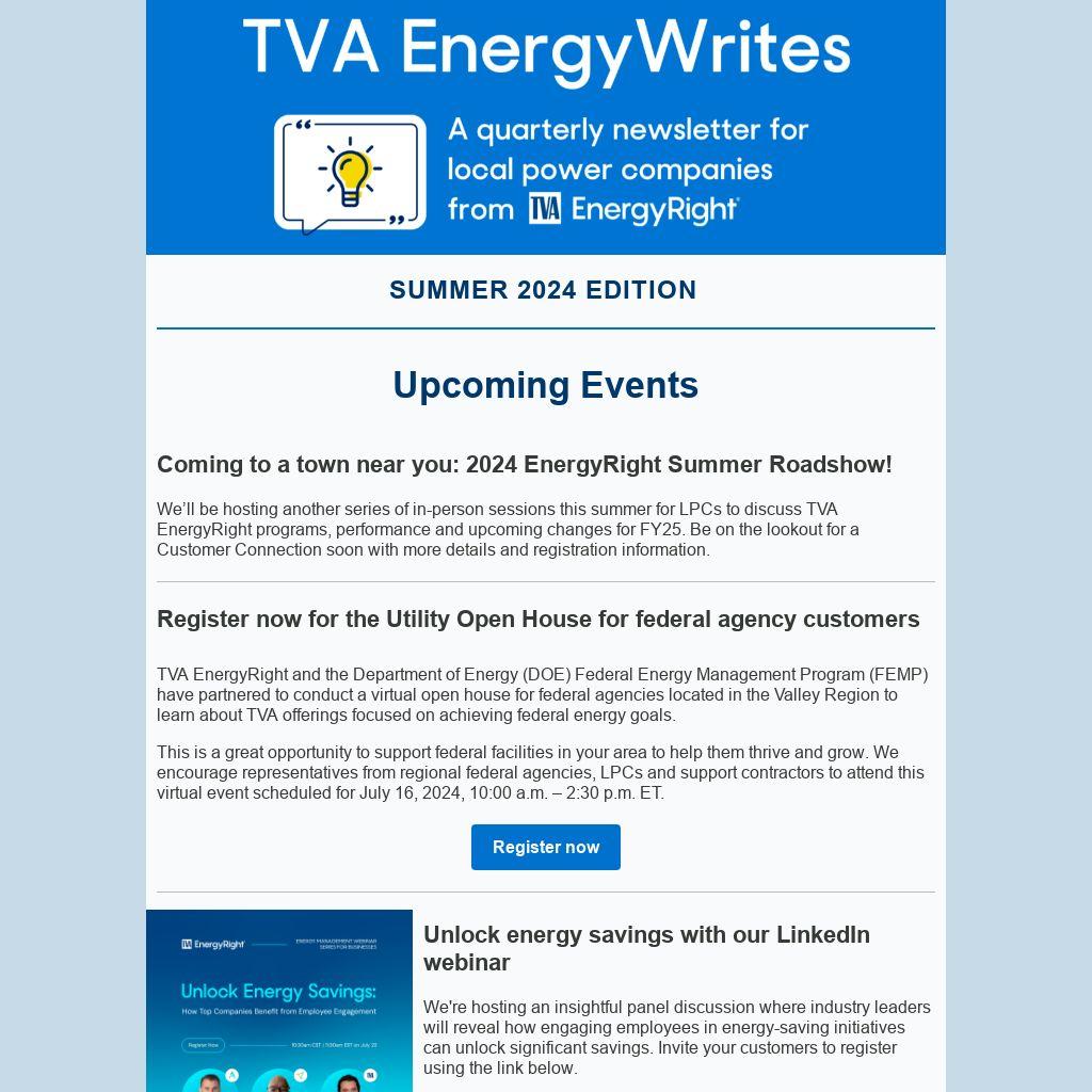 We’ll be hosting another series of in-person sessions this summer for LPCs to discuss TVA EnergyRight programs, performance and upcoming changes for FY25. Be on the lookout for a Customer Connection soon with more details and registration information.