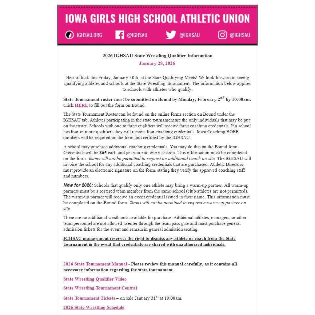 2026 IGHSAU State Wrestling Qualifier Information