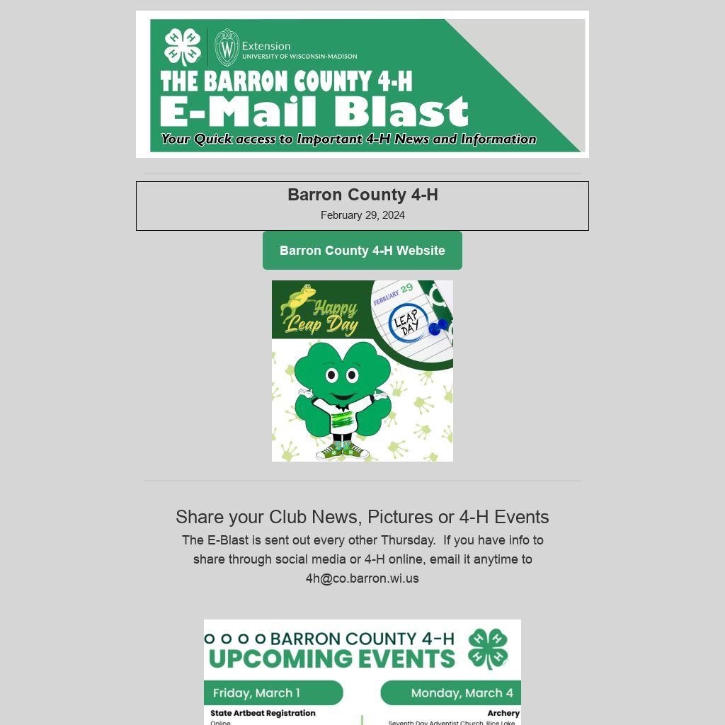 The E-Blast is sent out every other Thursday. If you have info to share through social media or 4-H online, email it anytime to 4h@co.barron.wi.us