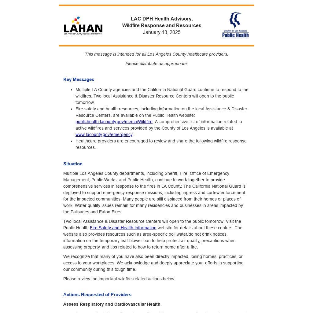 Multiple Los Angeles County departments, including Sheriff, Fire, Office of Emergency Management, Public Works, and Public Health, continue to work together to provide comprehensive services in response to the fires in LA County. The California National Guard is deployed to support emergency response missions, including ingress and curfew enforcement for the impacted communities. Many people are still displaced from their homes or places of work. Water quality issues remain for many residencies and businesses in areas impacted by the Palisades and Eaton Fires.