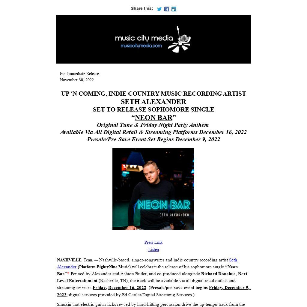 NASHVILLE, Tenn. — Nashville-based, singer-songwriter and indie country recording artist Seth Alexander (Platform EightyNine Music) will celebrate the release of his sophomore single “Neon Bar.”* Penned by Alexander and Ashton Butler, and co-produced alongside Richard Donahue, Next Level Entertainment (Nashville, TN), the track will be available via all digital retail outlets and streaming services Friday, December 16, 2022. (Presale/pre-save event begins Friday, December 9, 2022; digital services provided by Ed Gertler/Digital Streaming Services.)