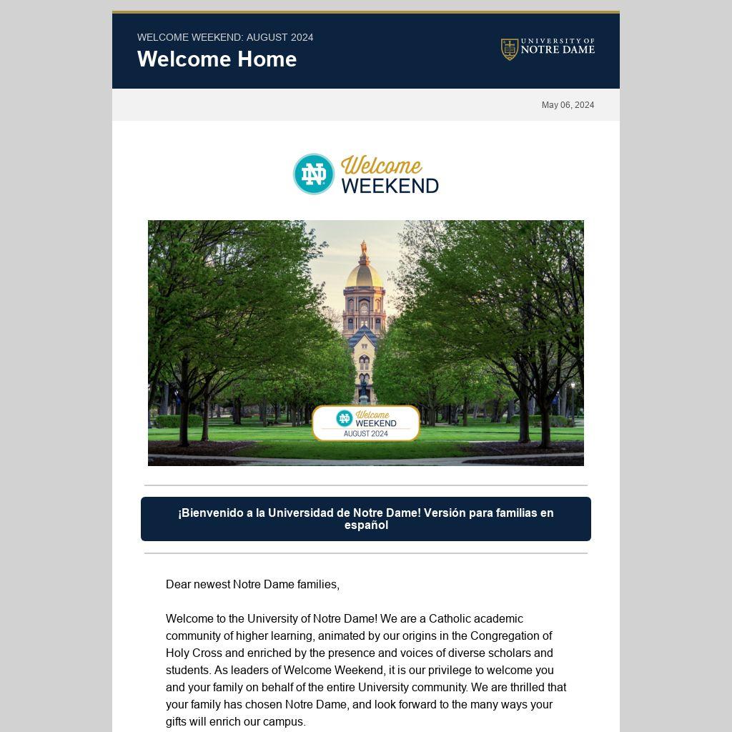 Welcome to the University of Notre Dame! We are a Catholic academic community of higher learning, animated by our origins in the Congregation of Holy Cross and enriched by the presence and voices of diverse scholars and students. As leaders of Welcome Weekend, it is our privilege to welcome you and your family on behalf of the entire University community. We are thrilled that your family has chosen Notre Dame, and look forward to the many ways your gifts will enrich our campus.