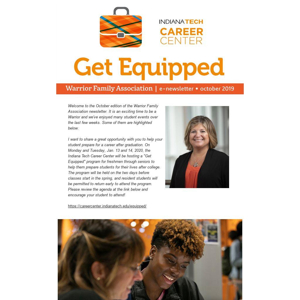 I want to share a great opportunity with you to help your student prepare for a career after graduation. On Monday and Tuesday, Jan. 13 and 14, 2020, the Indiana Tech Career Center will be hosting a "Get Equipped" program for freshmen through seniors to help them prepare students for their lives after college. The program will be held on the two days before classes start in the spring, and resident students will be permitted to return early to attend the program. Please review the agenda at the link below and encourage your student to attend!