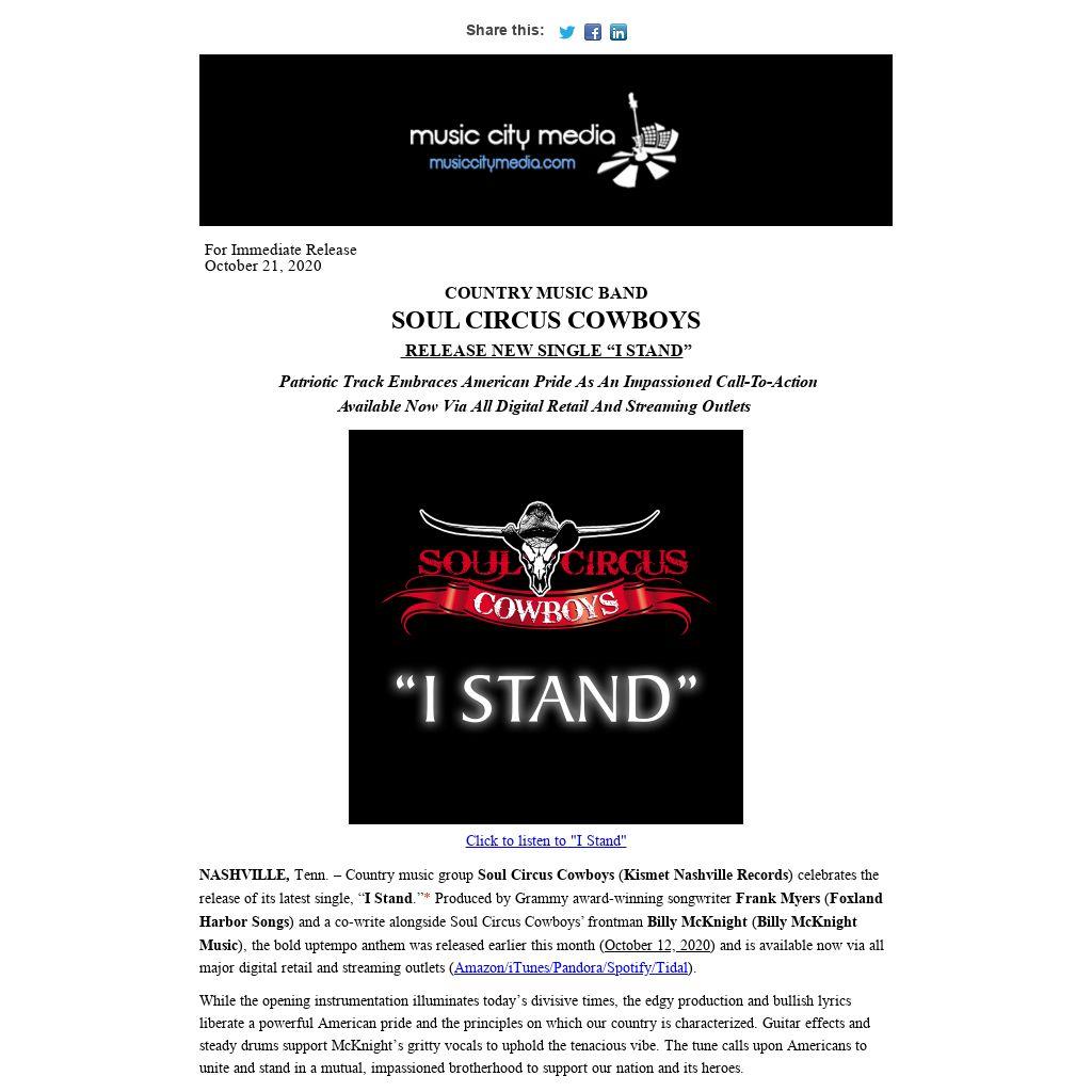 “We are not a perfect nation,” introduced “I Stand” co-writer and Soul Circus Cowboys’ lead singer, Billy McKnight. “But in these times, it’s more important than ever to stand in support of our brothers and sisters in need, and recall those who have stood before us—in service and in protection, and in appreciation for the freedoms that we do enjoy. …and continue to stand, together, with pride.”