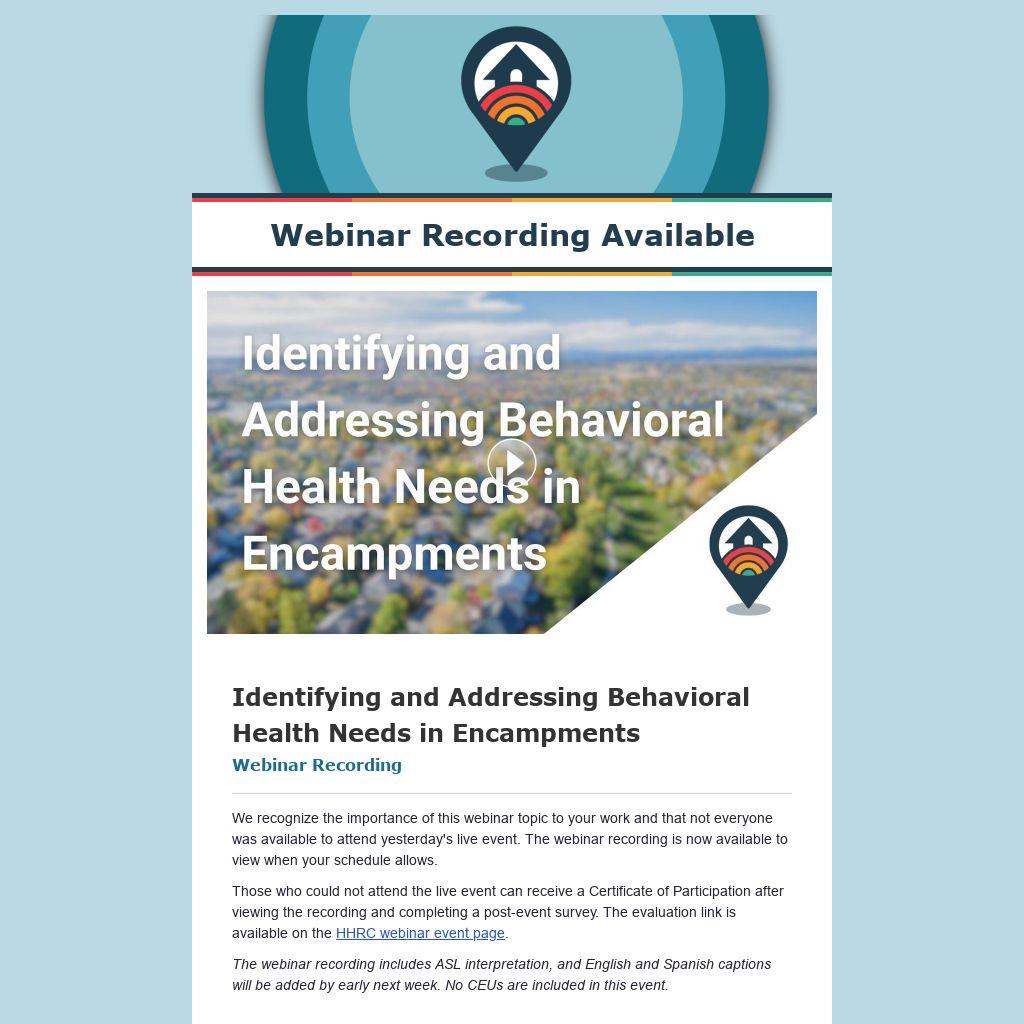 People experiencing homelessness experience higher rates of behavioral health conditions, and many symptoms can be caused or exacerbated by their living situations. As communities across the country change how they respond to and interact with encampments, outreach workers, community health workers, and peers continue to be essential team members who foster relationships and trust with encampment residents. These front-line professionals are often first to notice the onset or changes in behavioral health symptoms and serve as trusted individuals who can help support a person across a spectrum of behavioral health needs. This webinar discussed core principles and engagement techniques for providers to serve as a bridge to care for mental health, substance use, and medical needs.