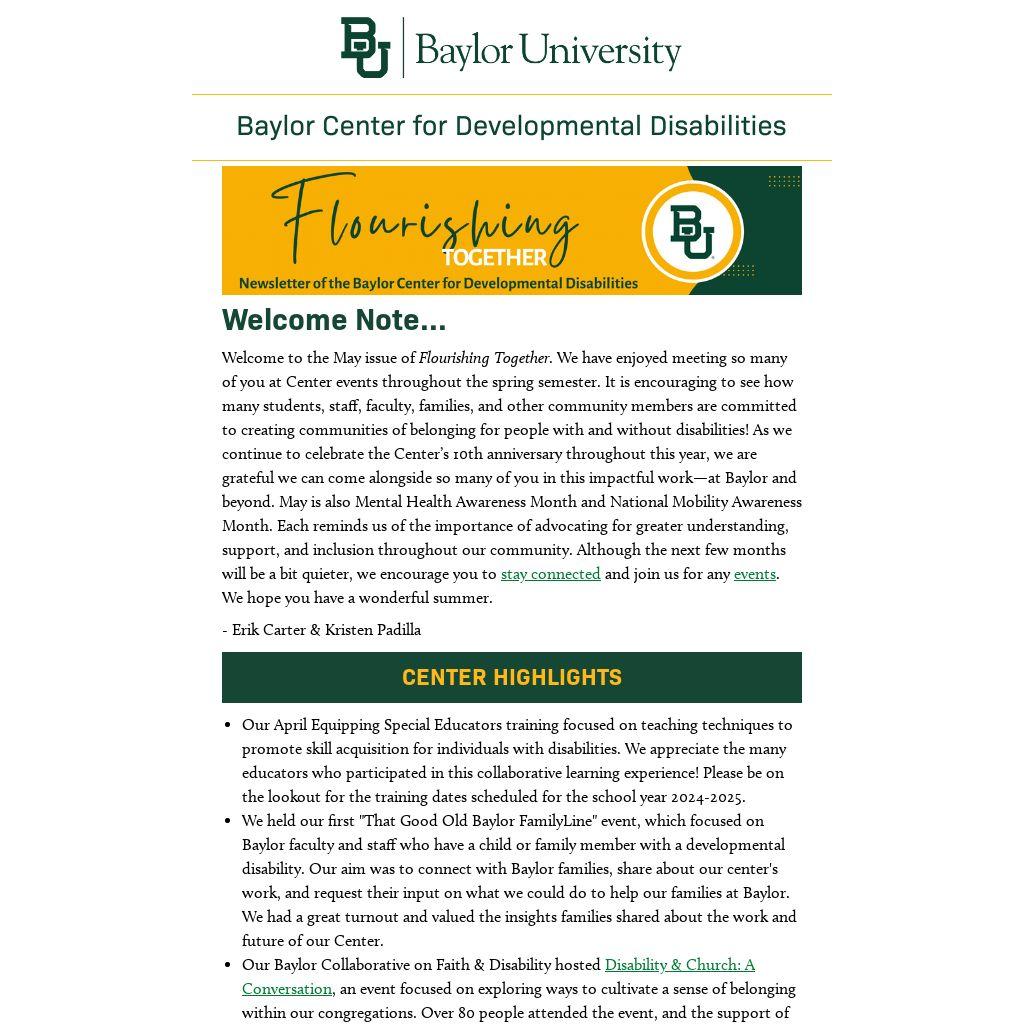 Welcome to the May issue of Flourishing Together. We have enjoyed meeting so many of you at Center events throughout the spring semester. It is encouraging to see how many students, staff, faculty, families, and other community members are committed to creating communities of belonging for people with and without disabilities! As we continue to celebrate the Center’s 10th anniversary throughout this year, we are grateful we can come alongside so many of you in this impactful work—at Baylor and beyond. May is also Mental Health Awareness Month and National Mobility Awareness Month. Each reminds us of the importance of advocating for greater understanding, support, and inclusion throughout our community. Although the next few months will be a bit quieter, we encourage you to stay connected and join us for any events. We hope you have a wonderful summer.