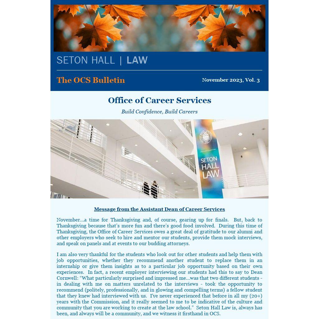 I am also very thankful for the students who look out for other students and help them with job opportunities, whether they recommend another student to replace them in an internship or give them insights as to a particular job opportunity based on their own experiences. In fact, a recent employer interviewing our students had this to say to Dean Cornwell: “What particularly surprised and impressed me…was that two different students - in dealing with me on matters unrelated to the interviews - took the opportunity to recommend (politely, professionally, and in glowing and compelling terms) a fellow student that they knew had interviewed with us. I've never experienced that before in all my (20+) years with the Commission, and it really seemed to me to be indicative of the culture and community that you are working to create at the law school.” Seton Hall Law is, always has been, and always will be a community, and we witness it firsthand in OCS.