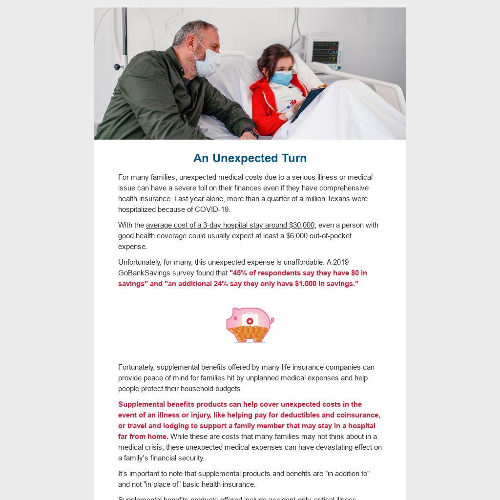 Supplemental benefits products can help cover unexpected costs in the event of an illness or injury, like helping pay for deductibles and coinsurance, or travel and lodging to support a family member that may stay in a hospital far from home. While these are costs that many families may not think about in a medical crisis, these unexpected medical expenses can have devastating effect on a family's financial security.