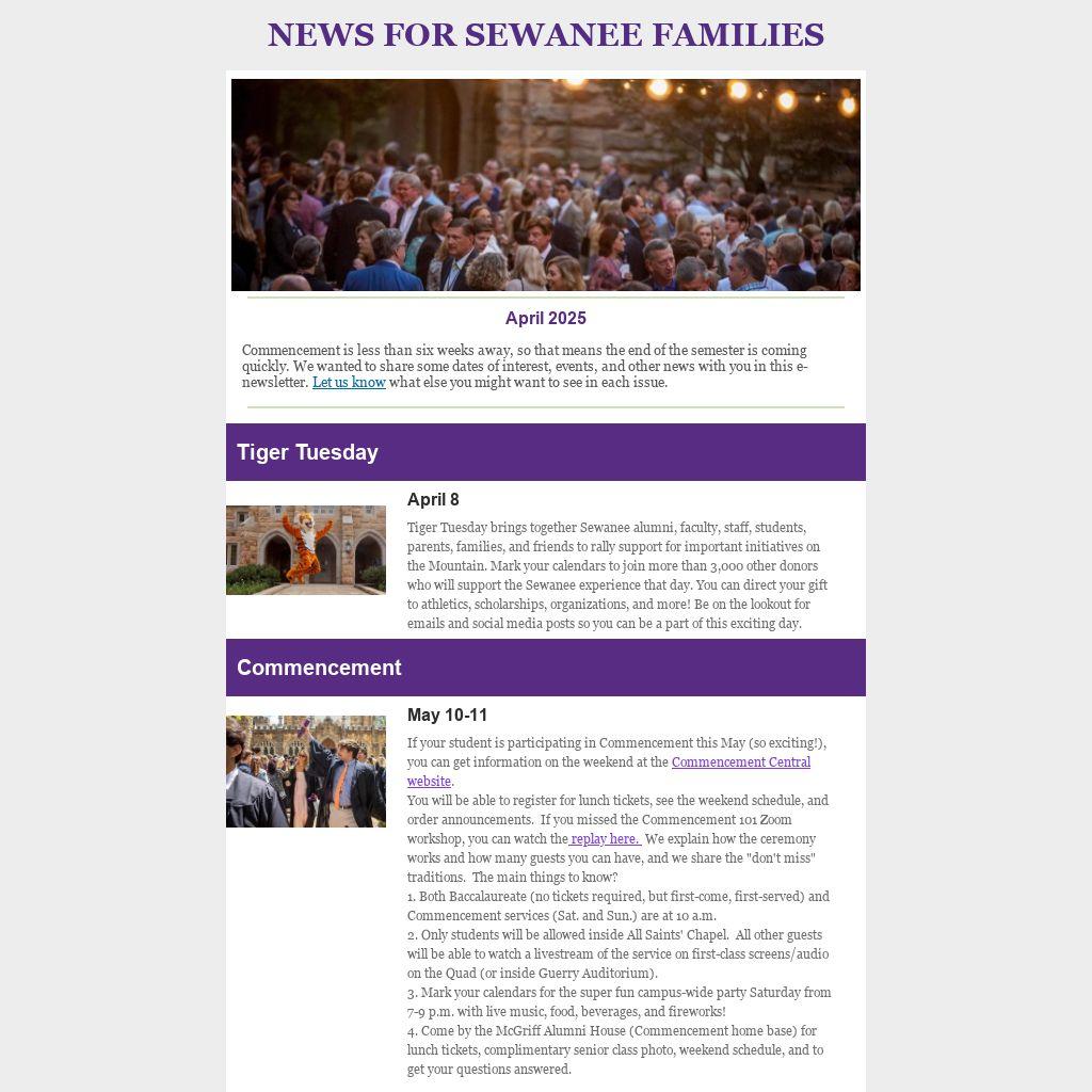 Commencement is less than six weeks away, so that means the end of the semester is coming quickly. We wanted to share some dates of interest, events, and other news with you in this e-newsletter. Let us know what else you might want to see in each issue.