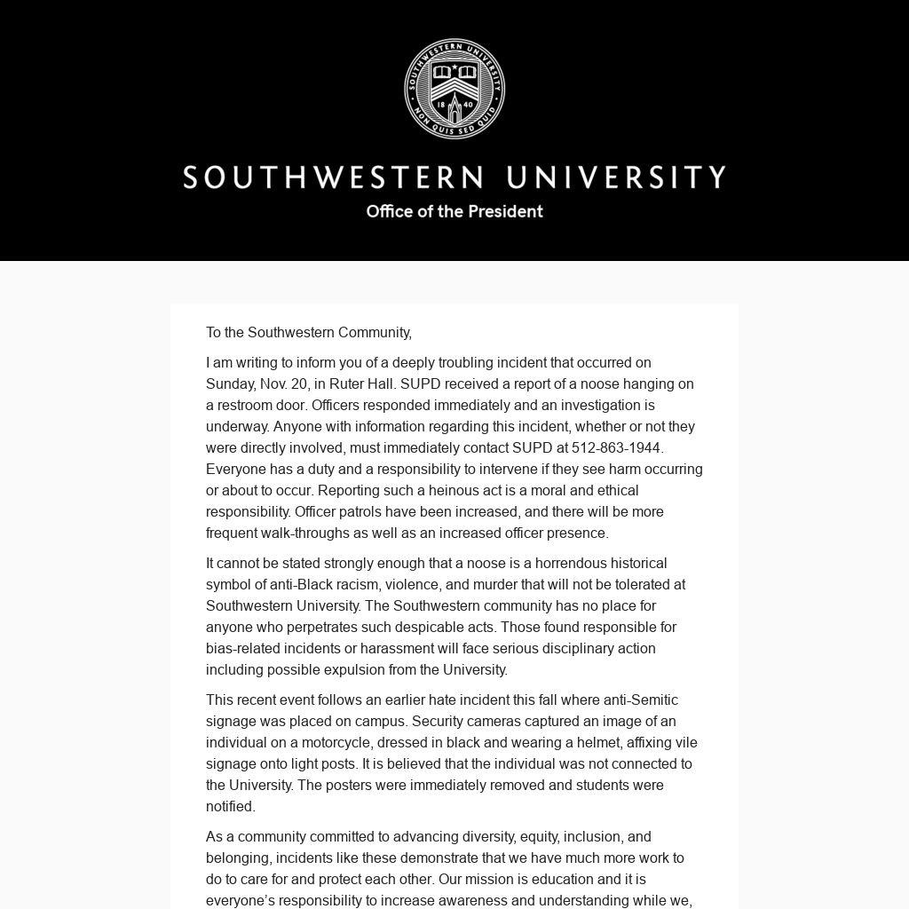 I am writing to inform you of a deeply troubling incident that occurred on Sunday, Nov. 20, in Ruter Hall. SUPD received a report of a noose hanging on a restroom door. Officers responded immediately and an investigation is underway. Anyone with information regarding this incident, whether or not they were directly involved, must immediately contact SUPD at 512-863-1944. Everyone has a duty and a responsibility to intervene if they see harm occurring or about to occur. Reporting such a heinous act is a moral and ethical responsibility. Officer patrols have been increased, and there will be more frequent walk-throughs as well as an increased officer presence.
