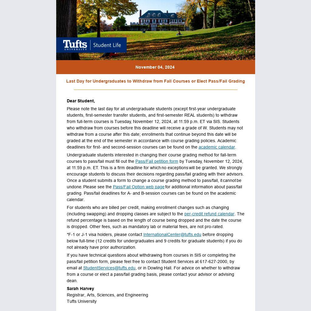 If you have technical questions about withdrawing from courses in SIS or completing the pass/fail petition form, please feel free to contact Student Services at 617-627-2000, by email at StudentServices@tufts.edu, or in Dowling Hall. For advice on whether to withdraw from a course or elect a pass/fail grading basis, please contact your advisor or advising dean.