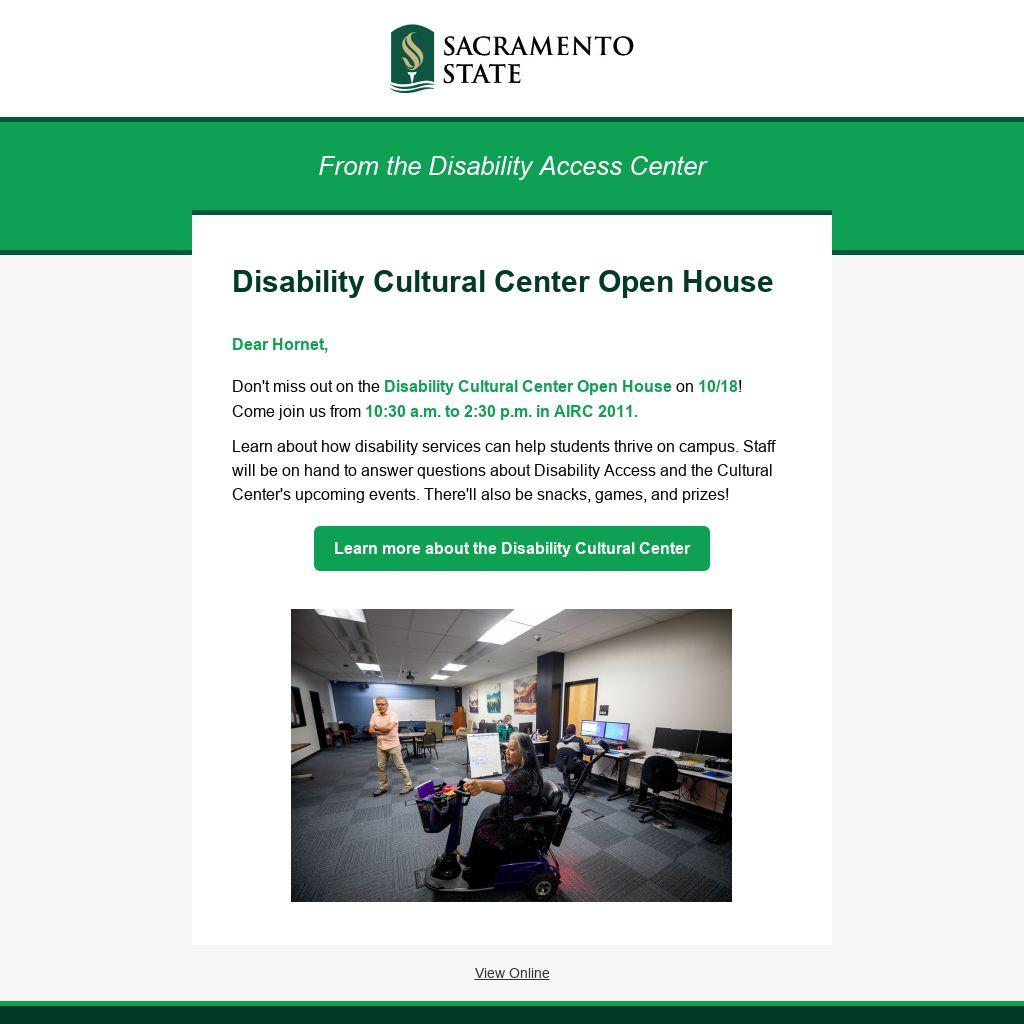 Don't miss out on the Disability Cultural Center Open House on 10/18! Come join us from 10:30 a.m. to 2:30 p.m. in AIRC 2011.