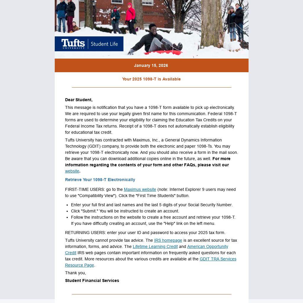 Tufts University has contracted with Maximus, Inc., a General Dynamics Information Technology (GDIT) company, to provide both the electronic and paper 1098-Ts. You may retrieve your 1098-T electronically now. And you should also receive a form in the mail soon. Be aware that you can download additional copies online in the future, as well. For more information regarding the contents of your form and other FAQs, please visit our website.