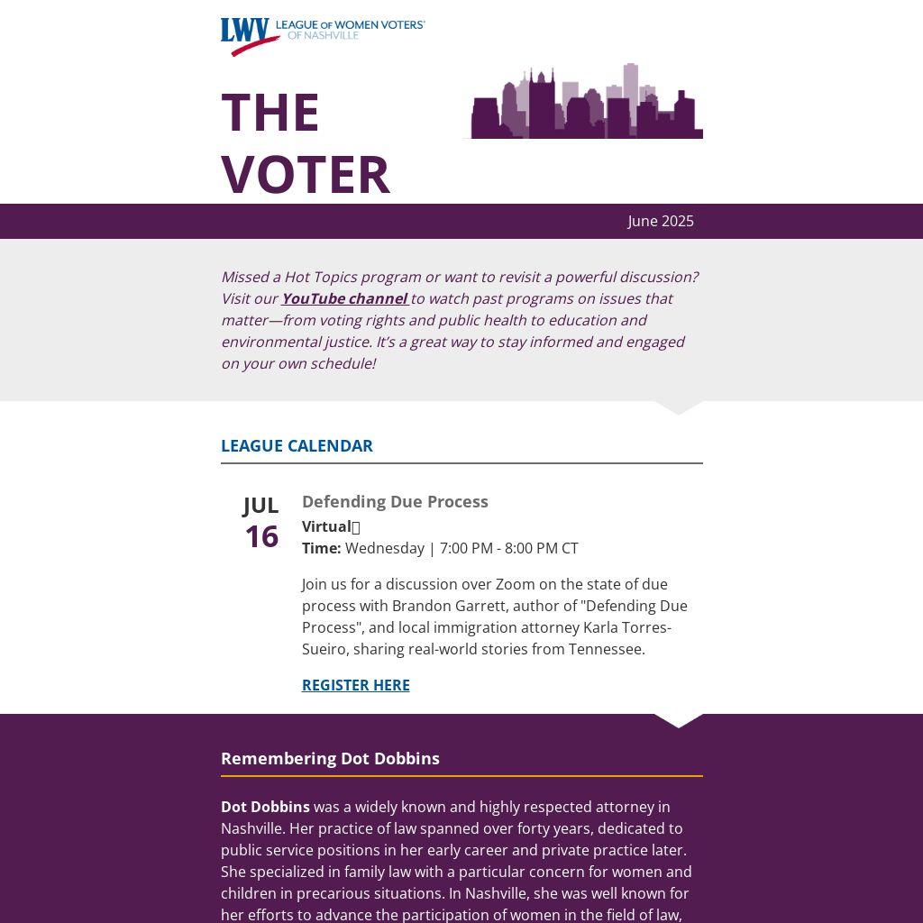 Hot Topics returns for the 2025-2026 term on August 1. Watch for information in the July Voter and our social media sites. As always, you will receive an email invitation to register for upcoming events!