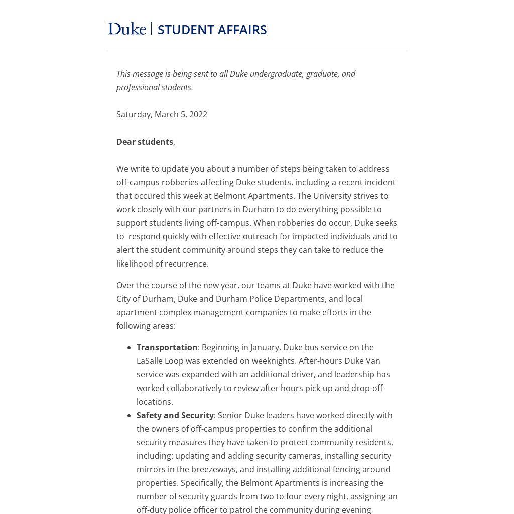EMERGENCY SERVICES: Duke maintains its own police department and supplemental security staff. They are on duty 24/7, 365 days a year. Officers are well-trained and resourced and have the same authority as law enforcement officers across the United States.