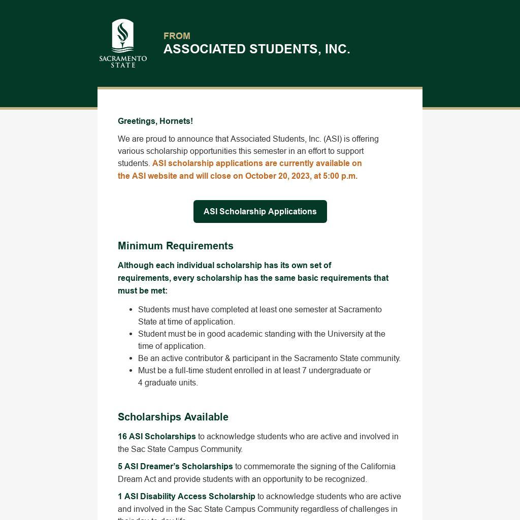 We encourage you to visit the ASI Website to find additional information about our scholarships, including descriptions, and applications for each scholarship.