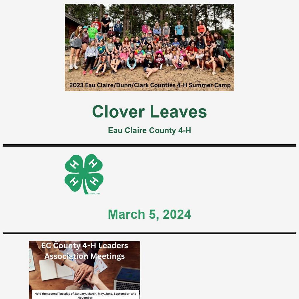 The next Leaders Association meeting will be Tuesday, March 12. PLEASE make every effort to come to these meetings. It is how we make connections and learn from each other to bring the best programs we can to the young people in our clubs. It connects your local club program to the wider recognition program and opportunities in 4-H.