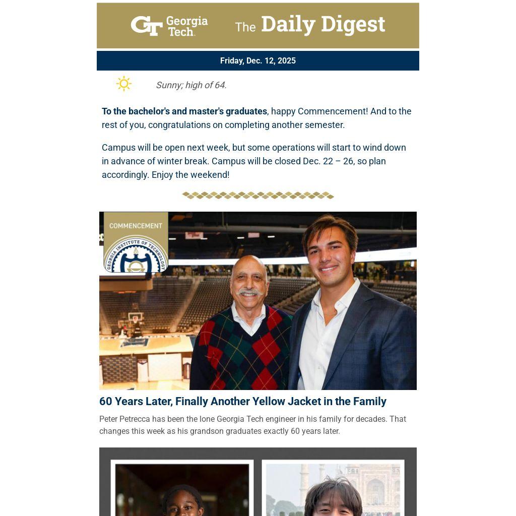 Peter Petrecca has been the lone Georgia Tech engineer in his family for decades. That changes this week as his grandson graduates exactly 60 years later.