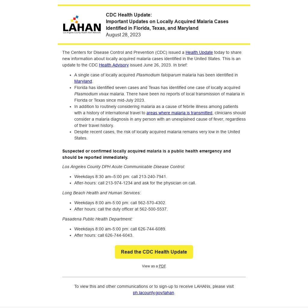 Suspected or confirmed locally acquired malaria is a public health emergency and should be reported immediately.