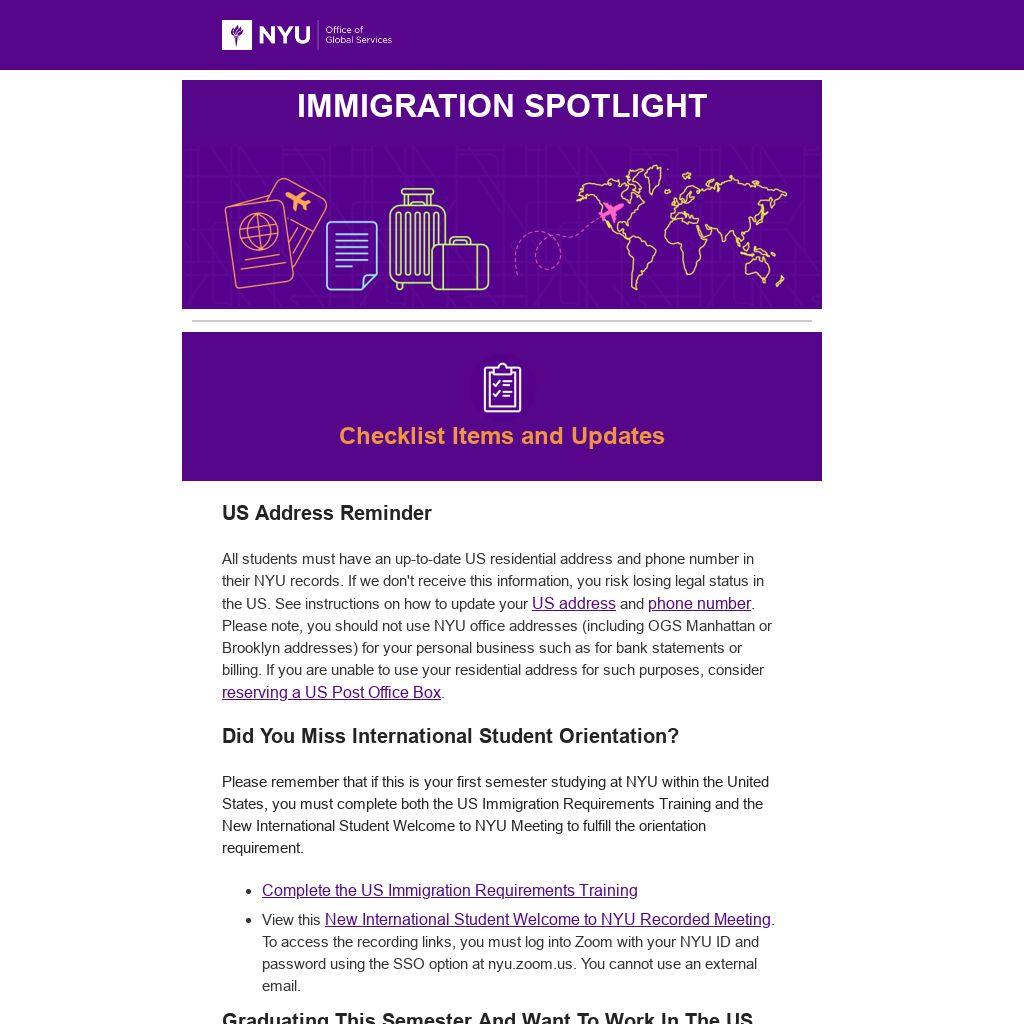 All students must have an up-to-date US residential address and phone number in their NYU records. If we don't receive this information, you risk losing legal status in the US. See instructions on how to update your