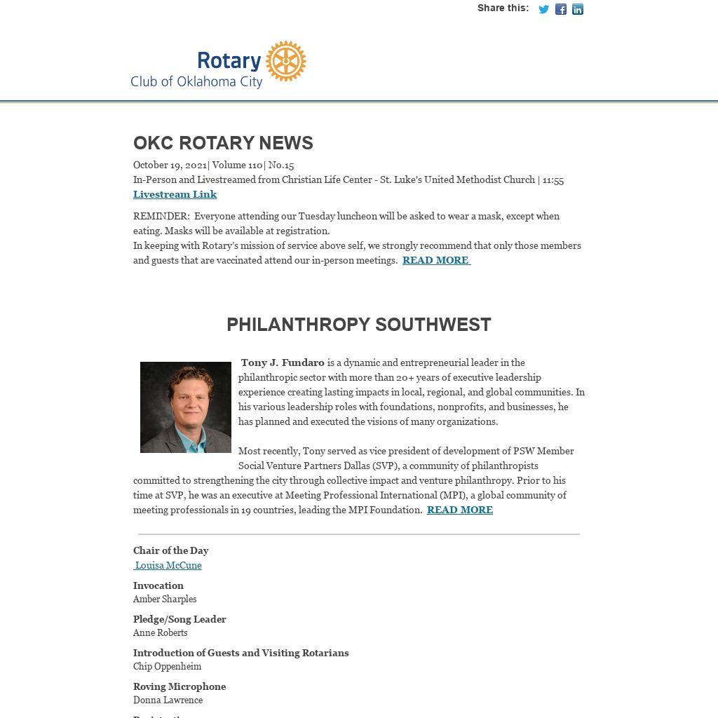 OKC Rotary NewsOctober 19, 2021| Volume 110| No.15 In-Person and Livestreamed from Christian Life Center - St. Luke's United Methodist Church | 11:55