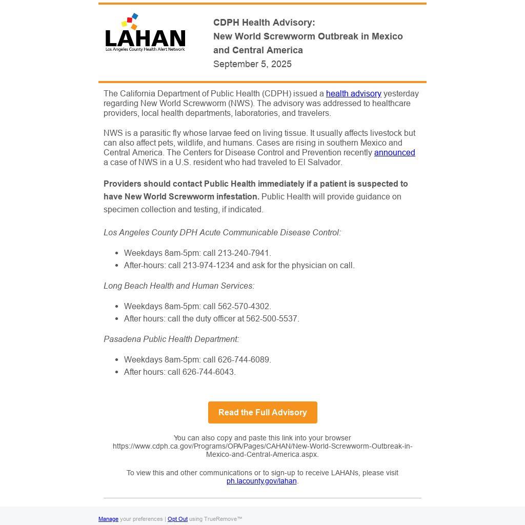 The California Department of Public Health (CDPH) issued a health advisory yesterday regarding New World Screwworm (NWS). The advisory was addressed to healthcare providers, local health departments, laboratories, and travelers.