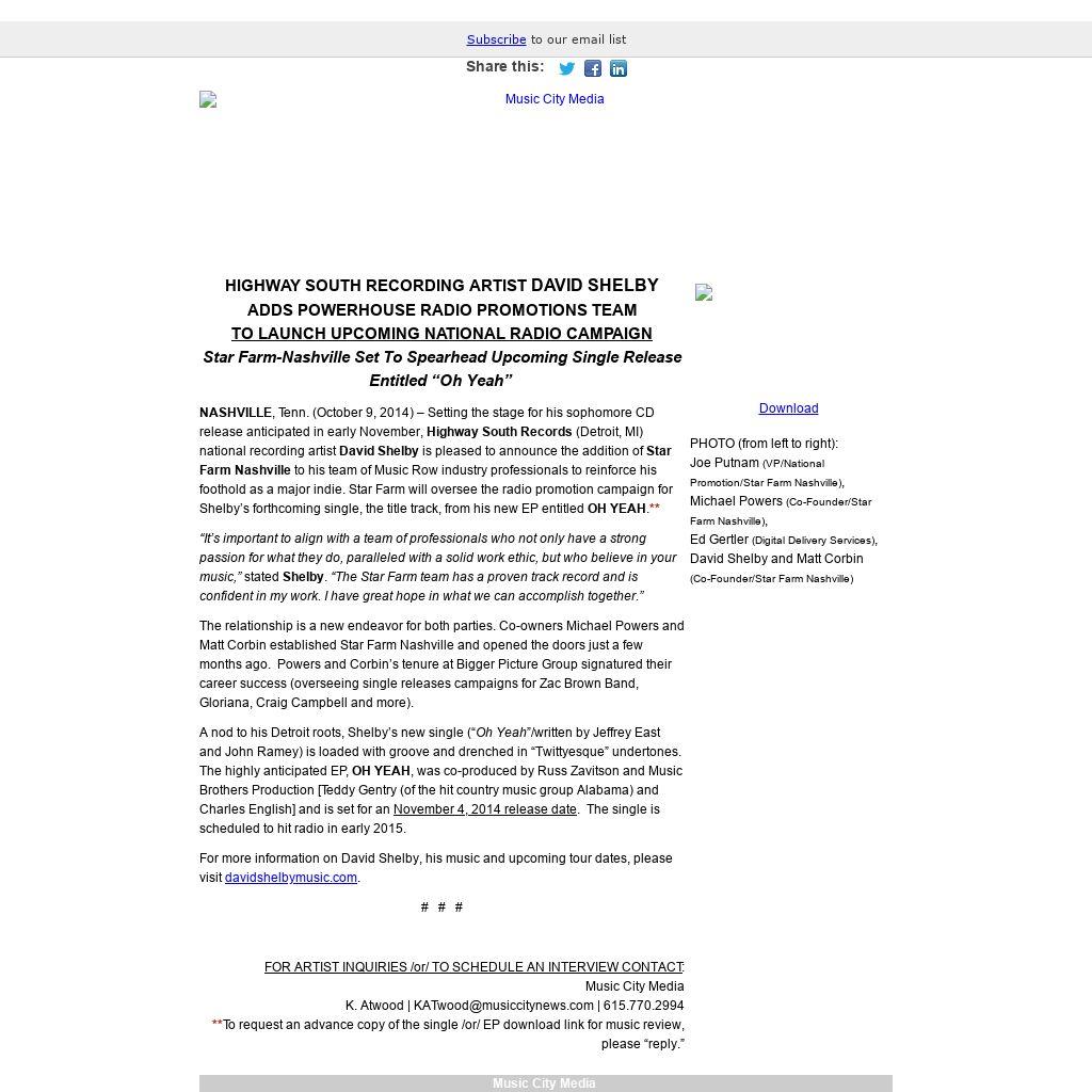 NASHVILLE, Tenn. (October 9, 2014) – Setting the stage for his sophomore CD release anticipated in early November, Highway South Records (Detroit, MI) national recording artist David Shelby is pleased to announce the addition of Star Farm Nashville to his team of Music Row industry professionals to reinforce his foothold as a major indie. Star Farm will oversee the radio promotion campaign for Shelby’s forthcoming single, the title track, from his new EP entitled OH YEAH.**
