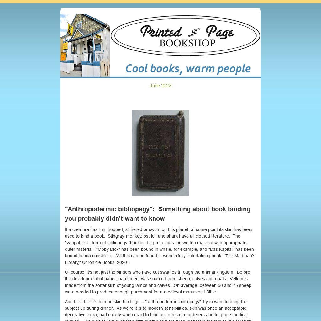 If a creature has run, hopped, slithered or swum on this planet, at some point its skin has been used to bind a book. Stingray, monkey, ostrich and shark have all clothed literature. The 'sympathetic' form of bibliopegy (bookbinding) matches the written material with appropriate outer material. "Moby Dick" has been bound in whale, for example, and "Das Kapital" has been bound in boa constrictor. (All this can be found in wonderfully entertaining book, "The Madman's Library," Chronicle Books, 2020.)