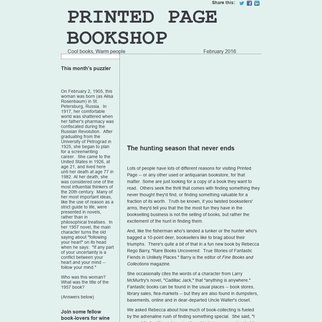 Lots of people have lots of different reasons for visiting Printed Page -- or any other used or antiquarian bookstore, for that matter. Some are just looking for a copy of a book they want to read. Others seek the thrill that comes with finding something they never thought they'd find, or finding something valuable for a fraction of its worth. Truth be known, if you twisted booksellers' arms, they'd tell you that the the most fun they have in the bookselling business is not the selling of books, but rather the excitement of the hunt in finding them.
