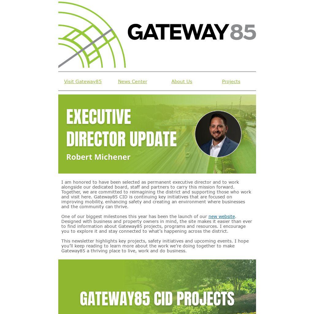 This newsletter highlights key projects, safety initiatives and upcoming events. I hope you’ll keep reading to learn more about the work we’re doing together to make Gateway85 a thriving place to live, work and do business.