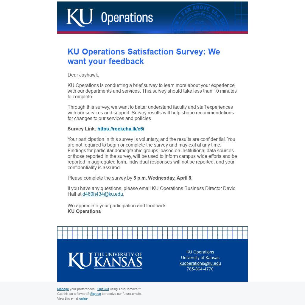 KU Operations is conducting a brief survey to learn more about your experience with our departments and services. This survey should take less than 10 minutes to complete.