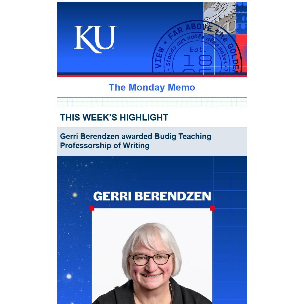 Gerri Berendzen, lecturer and coordinator of the Bremner Editing Center, has been awarded the Budig Teaching Professorship of Writing for academic year 2026. The professorship, established by former KU Chancellor Gene Budig and his wife, Gretchen, is awarded to a School of Journalism and Mass Communications faculty member who has demonstrated a commitment to excellence in the teaching of writing. As part of the professorship, Berendzen will present a lecture in the fall semester titled “When Writing and Editing Meet: The Growing Value of Revision.” The lecture will look at how revision boosts professionalism and credibility and why revision is particularly important in the age of artificial intelligence. The day and time of the lecture will be announced at a later date.