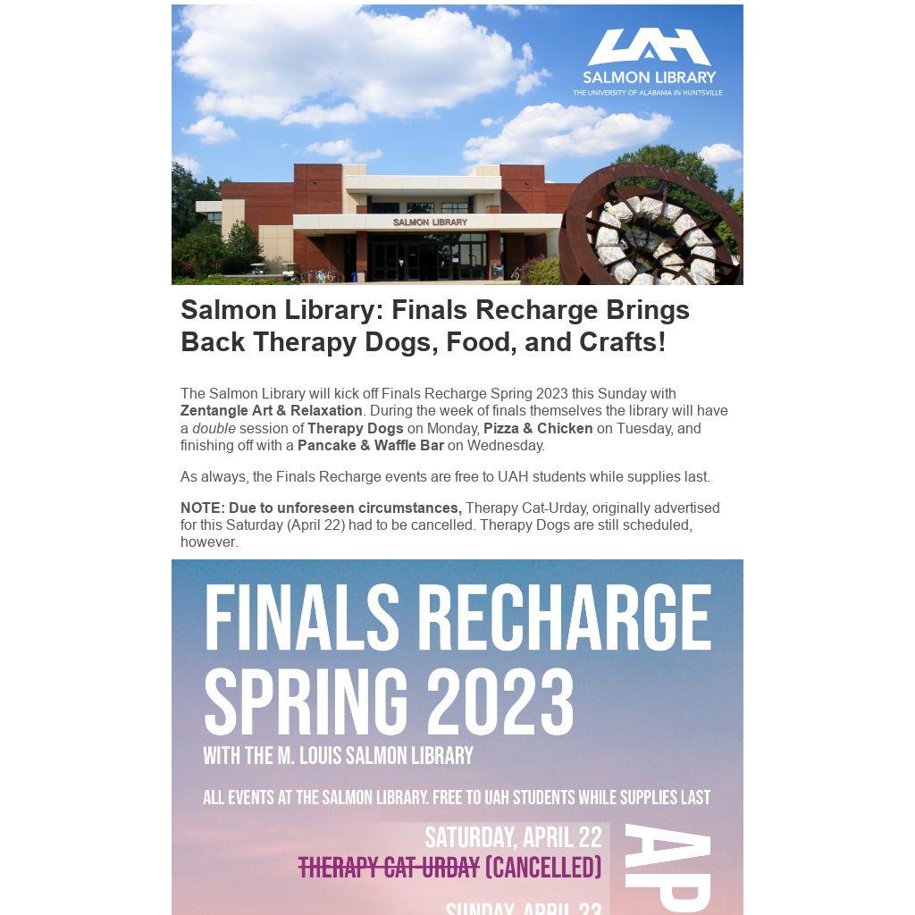 The Salmon Library will kick off Finals Recharge Spring 2023 this Sunday with Zentangle Art & Relaxation. During the week of finals themselves the library will have a double session of Therapy Dogs on Monday, Pizza & Chicken on Tuesday, and finishing off with a Pancake & Waffle Bar on Wednesday.