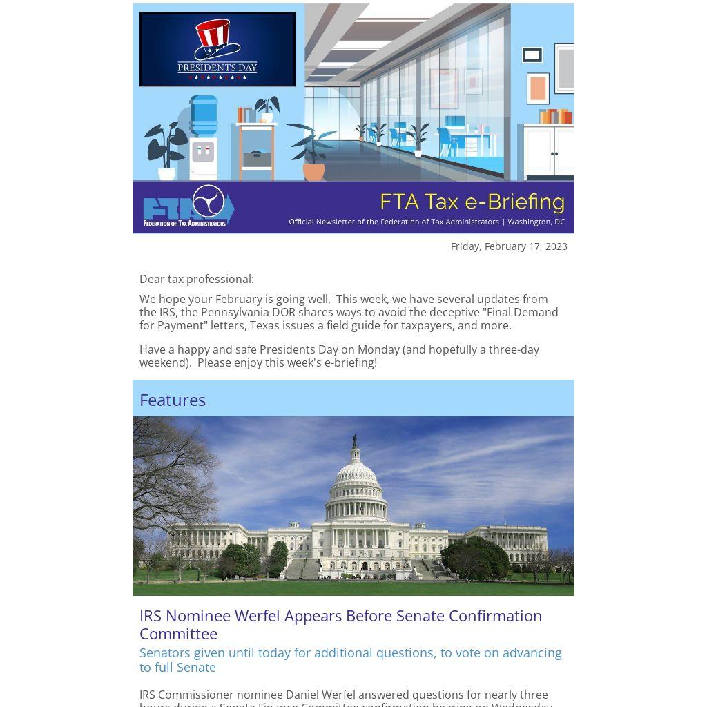 We hope your February is going well. This week, we have several updates from the IRS, the Pennsylvania DOR shares ways to avoid the deceptive "Final Demand for Payment" letters, Texas issues a field guide for taxpayers, and more.
