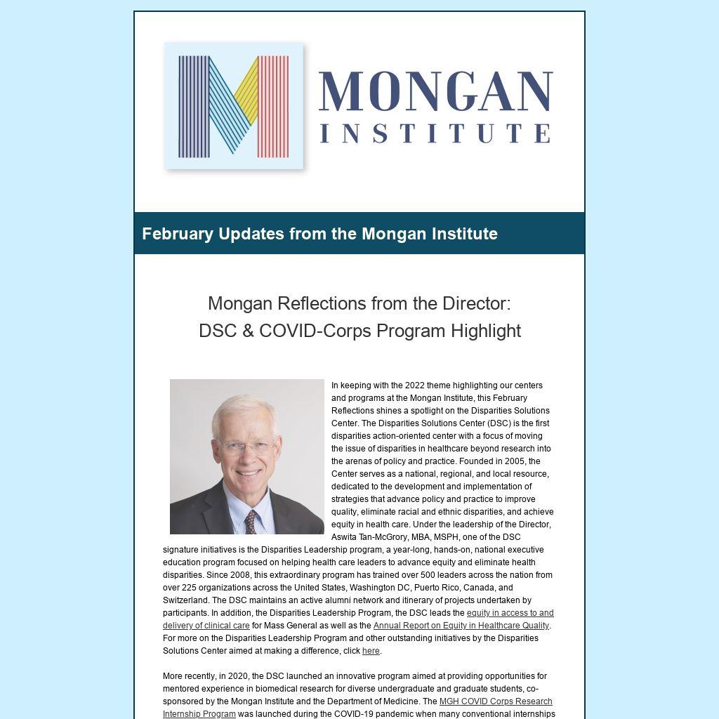 In keeping with the 2022 theme highlighting our centers and programs at the Mongan Institute, this February Reflections shines a spotlight on the Disparities Solutions Center. The Disparities Solutions Center (DSC) is the first disparities action-oriented center with a focus of moving the issue of disparities in healthcare beyond research into the arenas of policy and practice. Founded in 2005, the Center serves as a national, regional, and local resource, dedicated to the development and implementation of strategies that advance policy and practice to improve quality, eliminate racial and ethnic disparities, and achieve equity in health care. Under the leadership of the Director, Aswita Tan-McGrory, MBA, MSPH, one of the DSC signature initiatives is the Disparities Leadership program, a year-long, hands-on, national executive education program focused on helping health care leaders to advance equity and eliminate health disparities. Since 2008, this extraordinary program has trained over 500 leaders across the nation from over 225 organizations across the United States, Washington DC, Puerto Rico, Canada, and Switzerland. The DSC maintains an active alumni network and itinerary of projects undertaken by participants. In addition, the Disparities Leadership Program, the DSC leads the equity in access to and delivery of clinical care for Mass General as well as the Annual Report on Equity in Healthcare Quality. For more on the Disparities Leadership Program and other outstanding initiatives by the Disparities Solutions Center aimed at making a difference, click here. More recently, in 2020, the DSC launched an innovative program aimed at providing opportunities for mentored experience in biomedical research for diverse undergraduate and graduate students, co-sponsored by the Mongan Institute and the Department of Medicine. The MGH COVID Corps Research Internship Program was launched during the COVID-19 pandemic when many conventional internships were cancelled. The COVID Corps program provides a summer opportunity to conduct COVID-related research, specifically targeting historically underrepresented students in the biomedical research sciences. With thought-leading experts and mentors from the Mongan Institute and across MGH in areas such as epidemiology, population health, health care delivery research, computational biology, immunology, and other major research areas, the COVID Corps scholars have the unique opportunity to learn, grow, and expand their network as official members of the nation’s top hospital-based research program. In this month’s update, you will find a call for the third cohort of COVID-Corps scholars and mentors, as this innovative program continues to advance developing diverse future scientists. Under the close guidance of a carefully selected primary faculty lead mentor, MGH COVID Corps Scholars will benefit from participating in an exciting program of training, while actively contributing to COVID-related research projects to advance novel prevention and therapeutic strategies. More information on the COVID-corps Biomedical Research Internship program and the application process can be found on our website here. Please consider identifying potential candidates and contributing as a sponsor and faculty member in this outstanding program. - Steve Bartels, MD, MS