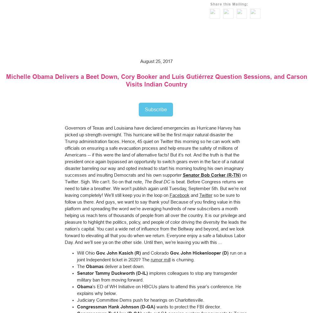 Governors of Texas and Louisiana have declared emergencies as Hurricane Harvey has picked up strength overnight. This hurricane will be the first major natural disaster the Trump administration faces. Hence, 45 quiet on Twitter this morning so he can work with officials on ensuring a safe evacuation process and help ensure the safety of millions of Americans -- if this were the land of alternative facts! But it’s not. And the truth is that the president once again bypassed an opportunity to switch gears even in the face of a natural disaster barreling our way and opted instead to start his morning touting his own imaginary successes and insulting Democrats and his own supporter Senator Bob Corker (R-TN) on Twitter. Sigh. We can’t. So on that note, The Beat DC is beat. Before Congress returns we need to take a breather. We won’t publish again until Tuesday, September 5th. But we’re not leaving completely! We’ll still keep you in the loop on Facebook and Twitter so be sure to follow us there. And guys, we want to say thank you! Because of you finding value in this platform and spreading the word we’re averaging hundreds of new subscribers a month helping us reach tens of thousands of people from all over the country. It is our privilege and pleasure to highlight the politics, policy, and people of color driving the diversity the leads the nation’s capital. You cast a wide net of influence from the Beltway and beyond, and we look forward to elevating all that you do when we return. Everyone enjoy a safe a fabulous Labor Day. And we’ll see ya on the other side. Until then, we’re leaving you with this ...- Will Ohio Gov. John Kasich (R) and Colorado Gov. John Hickenlooper (D) run on a joint Independent ticket in 2020? The rumor mill is churning.