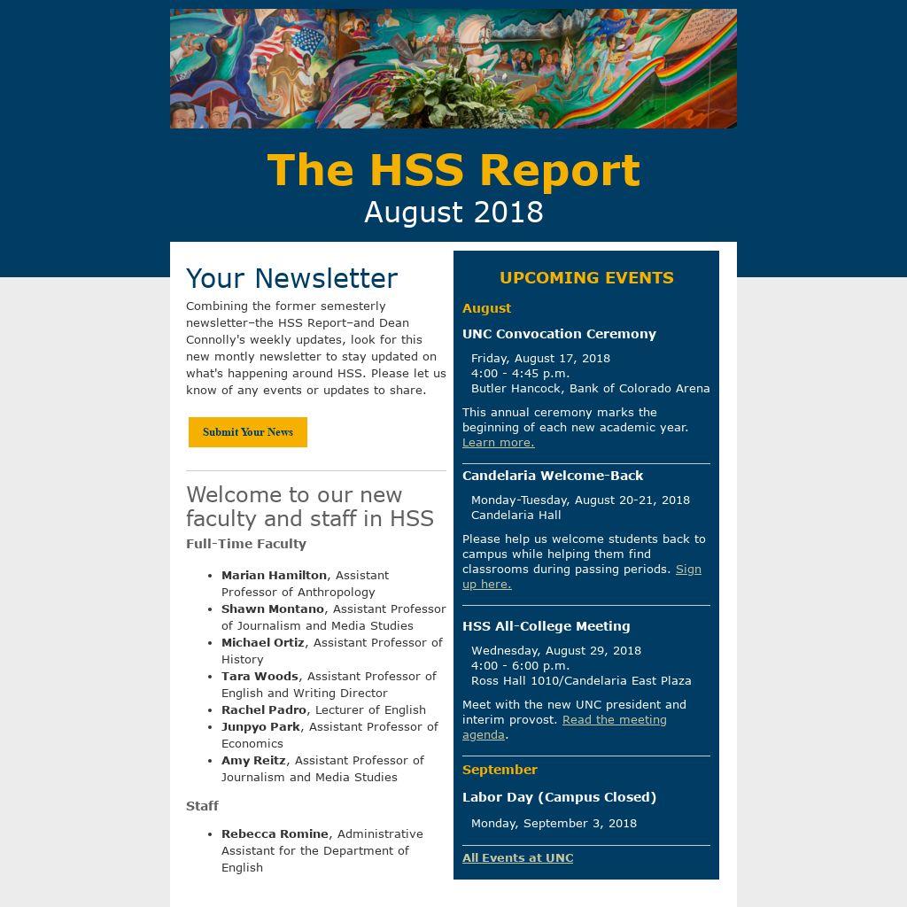 | Your NewsletterCombining the former semesterly newsletter–the HSS Report–and Dean Connolly's weekly updates, look for this new montly newsletter to stay updated on what's happening around HSS. Please let us know of any events or updates to share.