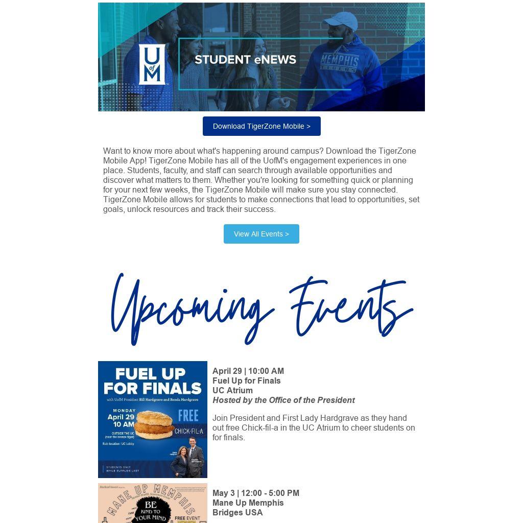 Want to know more about what's happening around campus? Download the TigerZone Mobile App! TigerZone Mobile has all of the UofM's engagement experiences in one place. Students, faculty, and staff can search through available opportunities and discover what matters to them. Whether you're looking for something quick or planning for your next few weeks, the TigerZone Mobile will make sure you stay connected. TigerZone Mobile allows for students to make connections that lead to opportunities, set goals, unlock resources and track their success.