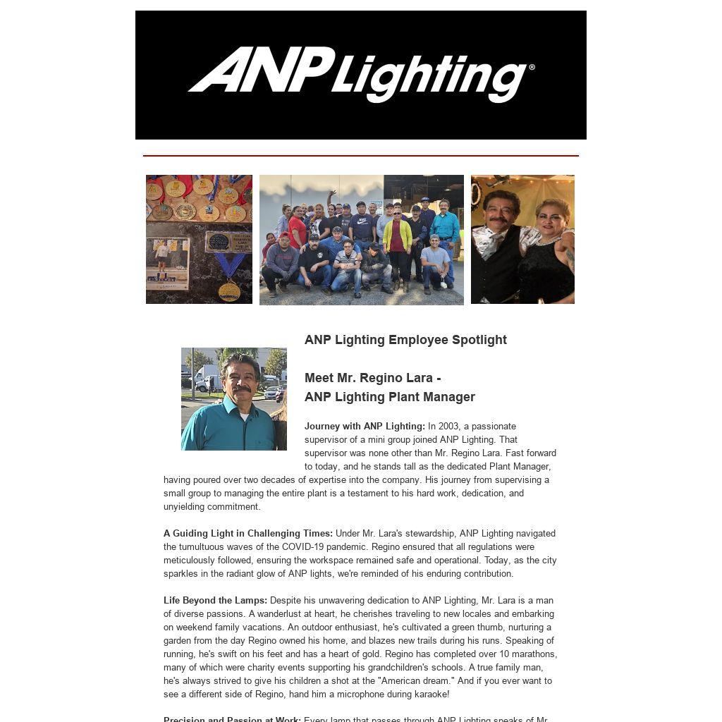 A Guiding Light in Challenging Times: Under Mr. Lara's stewardship, ANP Lighting navigated the tumultuous waves of the COVID-19 pandemic. Regino ensured that all regulations were meticulously followed, ensuring the workspace remained safe and operational. Today, as the city sparkles in the radiant glow of ANP lights, we're reminded of his enduring contribution.