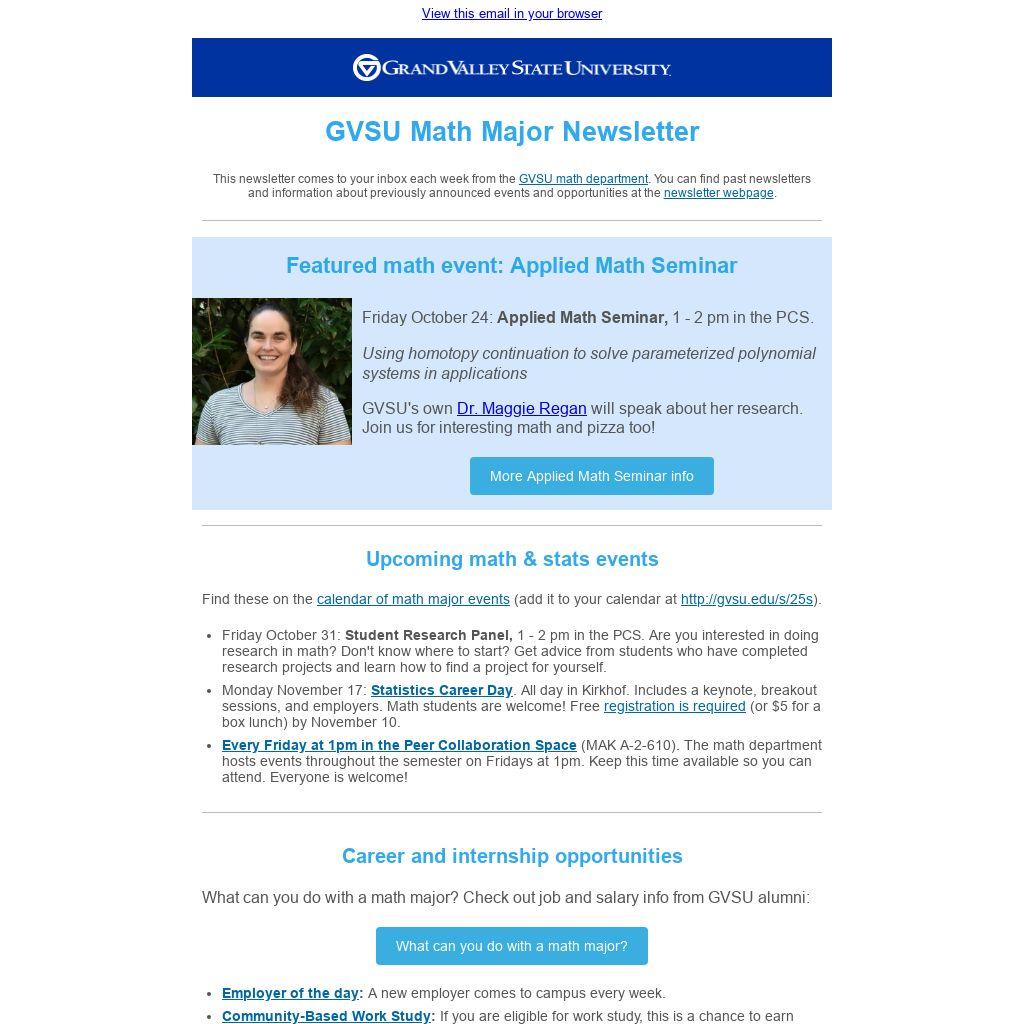 This newsletter comes to your inbox each week from the GVSU math department. You can find past newsletters and information about previously announced events and opportunities at the newsletter webpage.